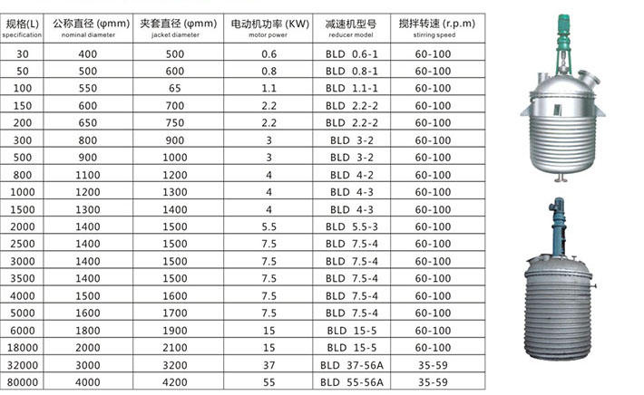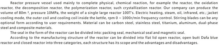 反应容器指主要用来完成物理、化学反应的压力容器,例如反应釜、氧化釜、分解釜、聚合釜、结晶釜等。我公司可制造容积80m³、压力10MPa、单台重量100T的大型反应釜。加热方式有电、蒸汽、导热油、红外线等.冷却方式为夹套、外盘管和釜内盘管冷却.转数O~1000r/min变频调速。搅拌桨叶的形式可根据用户的要求任意选配。材料可为碳钢、不锈钢、钛、铝合金、双相钢及其复合材料。 根据反应釜的密封形式不同可分为填料密封、机械密封和磁力密封。 根据反应釜的制造结构可分为开式平盖反应釜、开式对焊大法兰反应釜和闭式反应釜三大类.每一种结构部有它的适用范围和优缺点